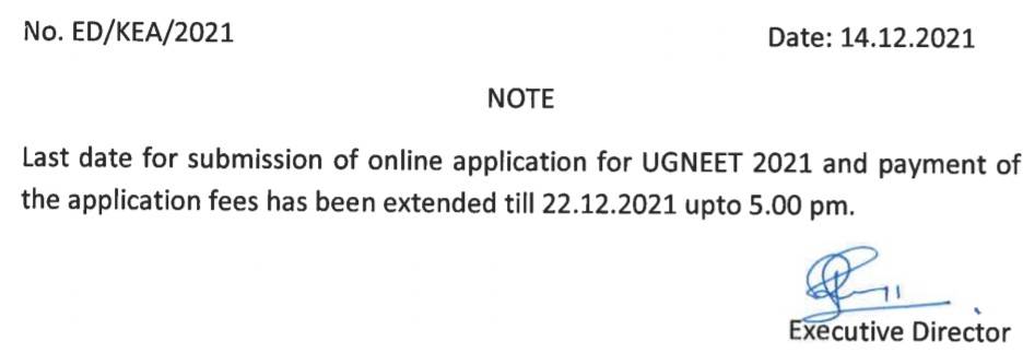 The latest is, KEA has notified that the last date for submission of online application for NEET-UG 2021 and payment of application fees have been extended till December 22, up to 5 pm.