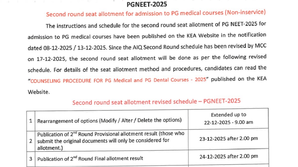 According to revised schedule, provisional Karnataka NEET PG 2025 seat allotment result for round 2 will be released on December 23, after 2 PM. Whereas, final Karnataka NEET PG counselling seat allotment result will be declared on December 24, 2025 at official website only.