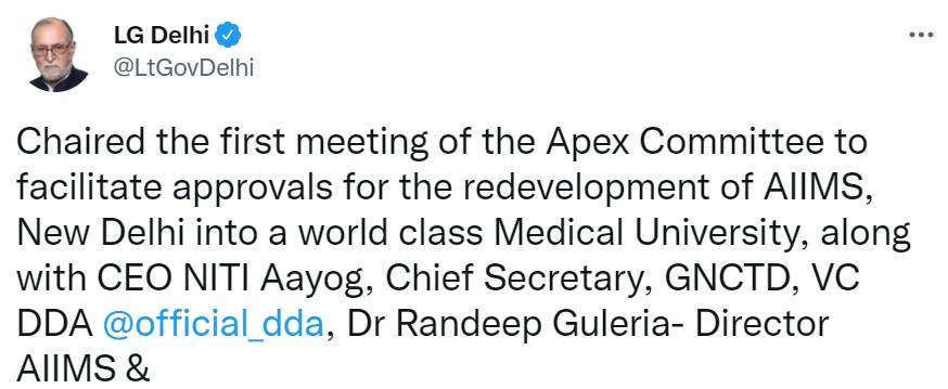 LG Delhi tweet reads, "Chaired the first meeting of the Apex Committee to facilitate approvals for the redevelopment of AIIMS, New Delhi into a world-class Medical University, along with CEO NITI Aayog, Chief Secretary, GNCTD, VC DDA @official_dda, Dr Randeep Guleria- Director AIIMS & other senior officials of concerned Departments/Agencies."