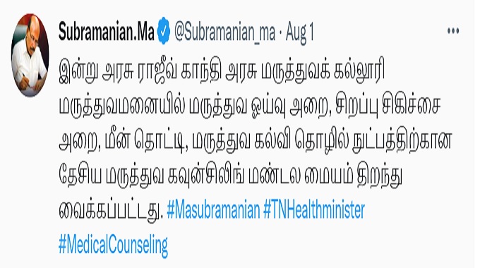 "Medical Rest Room, Special Treatment Room, Fish Tank, National Medical Counseling Zonal Center for Medical Education and Technology was inaugurated today at Government Rajiv Gandhi Government Medical College Hospital. #Masubramanian #TNHealthminister #MedicalCounseling," tweeted Ma Subramanian.