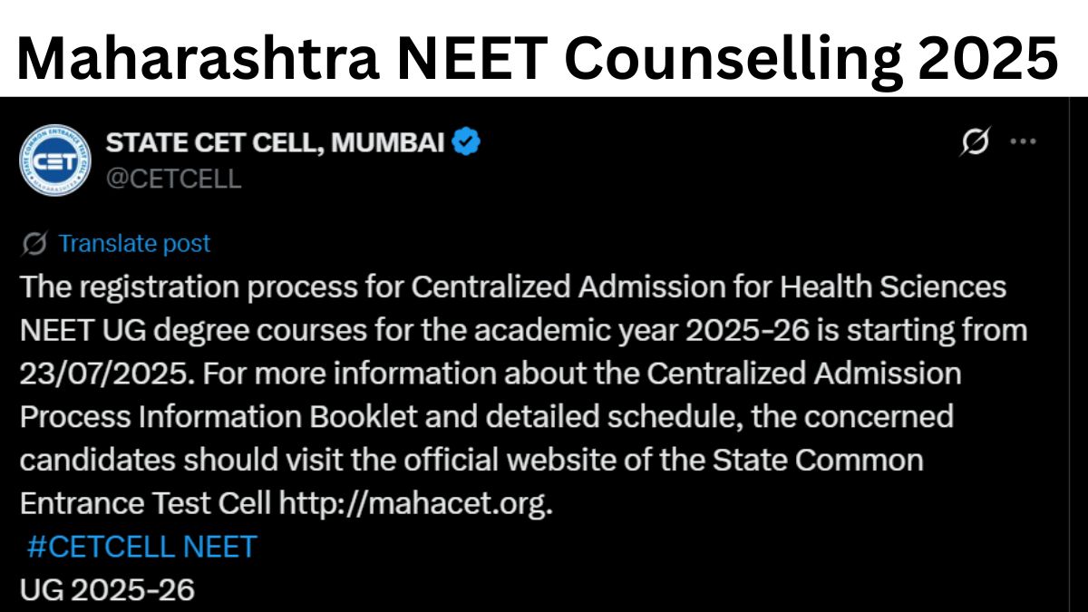 "The registration process for Centralised Admission for Health Sciences NEET UG degree courses for the academic year 2025-26 is starting from 23/07/2025. For more information about the Centralised Admission Process Information Booklet and detailed schedule, the concerned candidates should visit the official website of the State Common Entrance Test Cell mahacet.org." The State CET Cell, Mumbai, posted on social media platform 'X'.