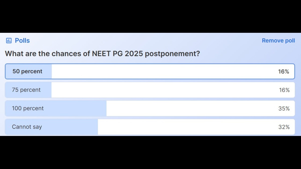 Students were asked about chances of NEET PG 2025 postponement and majority of them selected 100 percent option. They were provided 4 options, 50 percent, 75 percent, 100 percent and last one was can’t say options. Around 35 percent students selected ‘100 percent’ option, followed by 34 percent students who opted ‘can’t say’ option. 16 percent students believed chances of NEET PG 2025 exam postponement was 75%. 15 percent students were on middle ground, i.e they believed chances are 50-50.