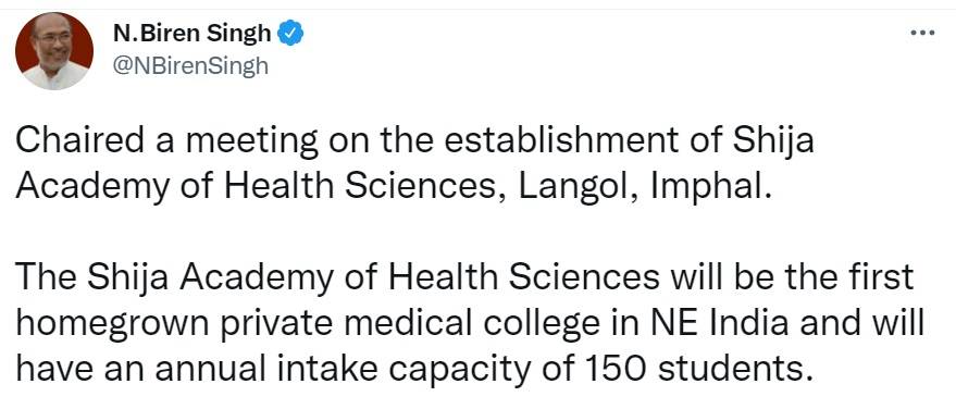 Manipur Chief Minister N Biren Singh tweet on December 6, reads, "Chaired a meeting on the establishment of Shija Academy of Health Sciences, Langol, Imphal. The Shija Academy of Health Sciences will be the first homegrown private medical college in NE India and will have an annual intake capacity of 150 students."