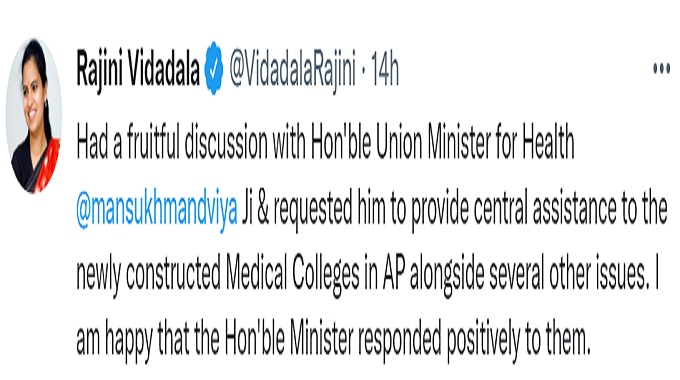 The Minister recalled that Chief Minister YS Jagan Mohan Reddy has taken steps to set up medical colleges in 26 districts. She sought the cooperation of the Central government for the construction of 16 new medical colleges in Andhra Pradesh, which are under construction.