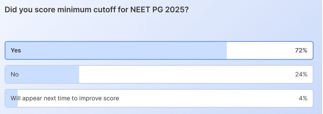 In the poll survey, candidates were asked to vote for ‘did you score the minimum cutoff for NEET PG 2025’. They were provided three options in the poll. Majority of participants (72%) chose yes option. 24% candidates selected no option, which referred they didn’t get required cutoff in the exam. Only 4% candidates chose ‘will appear next time to improve score’.