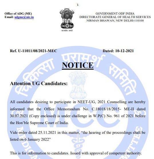 The notification states, “All candidates desiring to participate in NEET-UG, 2021 Counselling are hereby informed that the Office Memorandum No. C.18018/18/2015- ME-II dated 30.07.2021 (Copy enclosed) is under challenge in W.P(C) No. 961 of 2021 before the Hon’ble Supreme Court of India.”