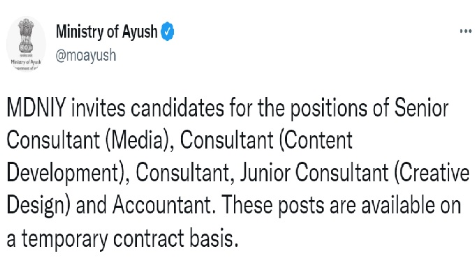 MDNIY is also hiring for the positions of Senior Consultant (Media), Consultant (Content Development), Consultant, Junior Consultant (Creative Design) and Accountant. These posts are available on a temporary contract basis. The recruitment will be done through a walk-in-interview on July 6, 2022, at MDNIY Delhi.