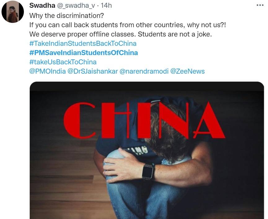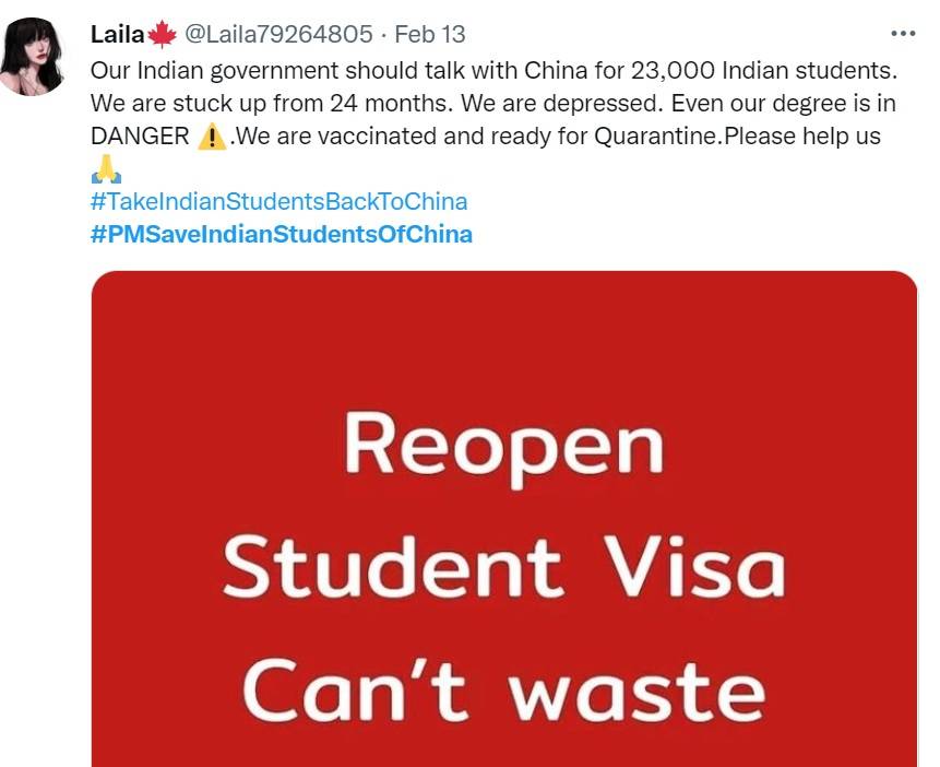 "Our Indian government should talk with China for 23,000 Indian students. We are stuck up from 24 months. We are depressed. Even our degree is in DANGER .We are vaccinated and ready for Quarantine.Please help us"