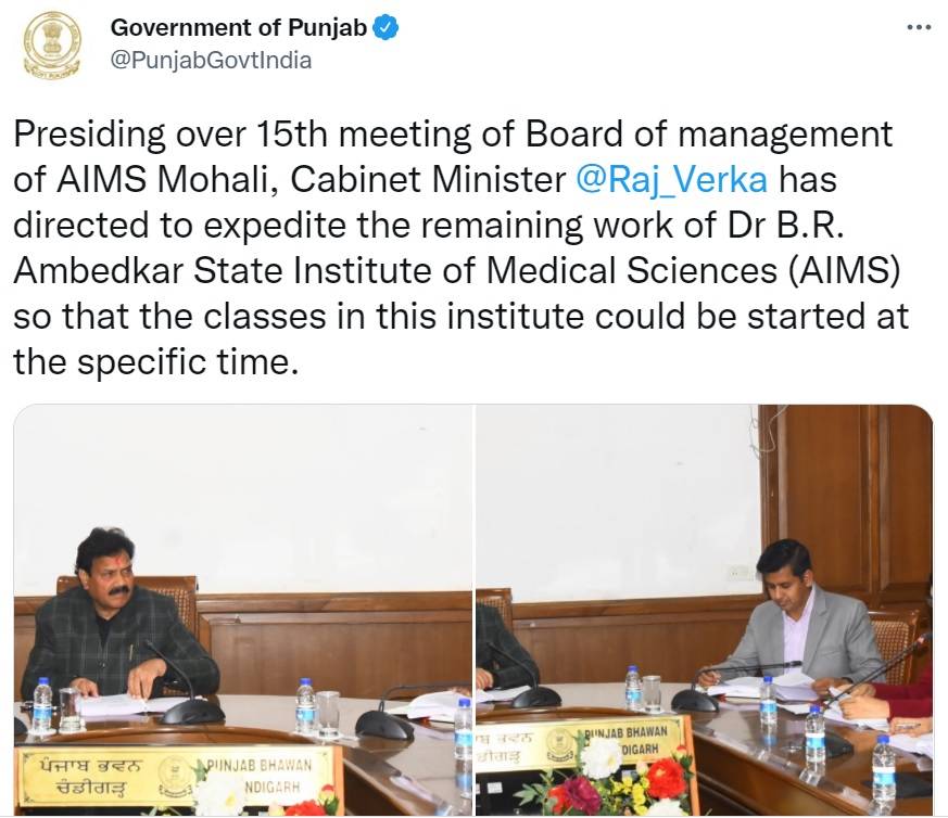 Recently, the Government of Punjab had tweeted, "Presiding over 15th meeting of Board of management of AIMS Mohali, Cabinet Minister @Raj_Verka has directed to expedite the remaining work of Dr B.R. Ambedkar State Institute of Medical Sciences (AIMS) so that the classes in this institute could be started at the specific time."