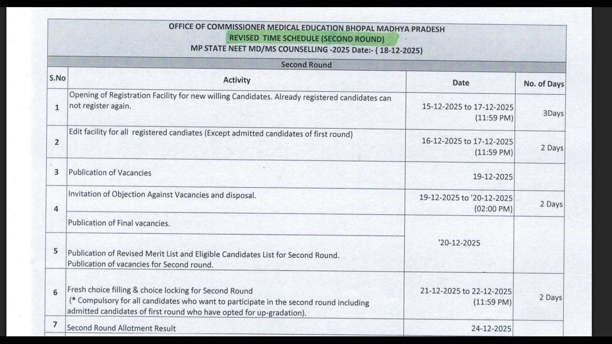 DME, MP has released revised dates and schedule for round-2 MP NEET PG 2025 counselling. Merit list will be released on December 20, 2025. Earlier it was to be uploaded on December 18, 2025. Students can declare choices online till December 22, 2025. Seat allotment result will be announced on December 24, 2025.