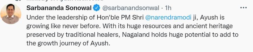 His tweet reads, "Under the leadership of Hon'ble PM Shri @narendramodi ji, Ayush is growing like never before. With its huge resources and ancient heritage preserved by traditional healers, Nagaland holds huge potential to add to the growth journey of Ayush."