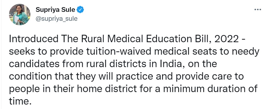 Her tweet reads, "Introduced The Rural Medical Education Bill, 2022 - seeks to provide tuition-waived medical seats to needy candidates from rural districts in India, on the condition that they will practice and provide care to people in their home district for a minimum duration of time."