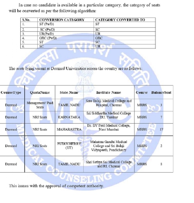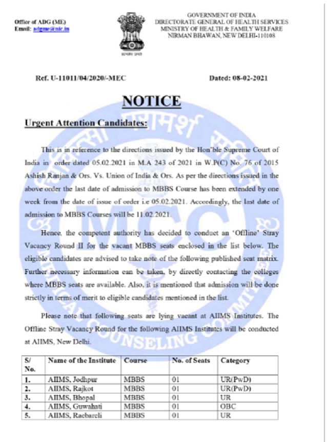 The MCC in the circular stated that: " the competent authority has decided to conduct an ‘Offline’ Stray Vacancy Round II for the vacant MBBS seats enclosed in the list below. The eligible candidates are advised to take note of the following published seat matrix. Further, necessary information can be taken, by directly contacting the colleges where MBBS seats are available. Also, it is mentioned that admission will be done strictly in terms of merit to eligible candidates mentioned in the list."