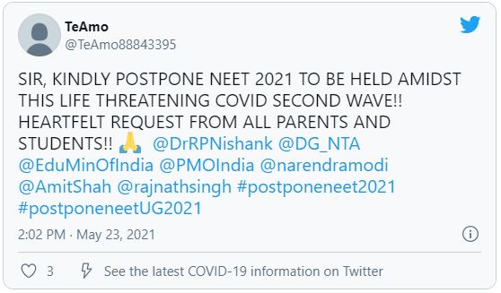 Because of the current Covid-19 pandemic, many NEET 2021 aspirants around the country are requesting that the National Eligibility Cumulative Entrance Test (NEET) 2021 be postponed. A group of students has taken to Twitter to voice their concerns. Students are using the hashtag #postponeNEET2021 to insist that the exam be postponed.