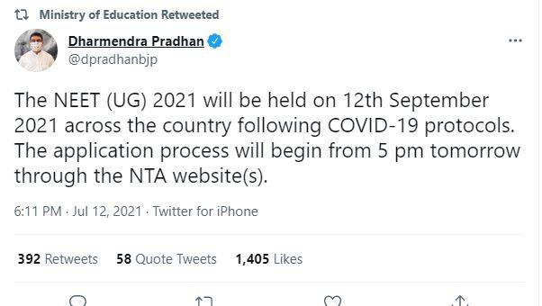 NEET 2021 will be conducted on September 12 across 198 cities in India. The application process will commence on July 13, 5 pm at NTA websites. The Union Education Minister Dharmendra Pradhan announced via tweet.