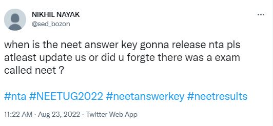 The NEET 2022 official answer keys were expected in the first week of August, or within August 17, a month of conducting the exam. The unwarranted delay caused anxiety and tension among the test-takers. They took to social media platforms like Twitter to express their concern. Sample the Tweet below.