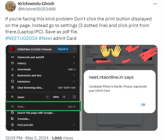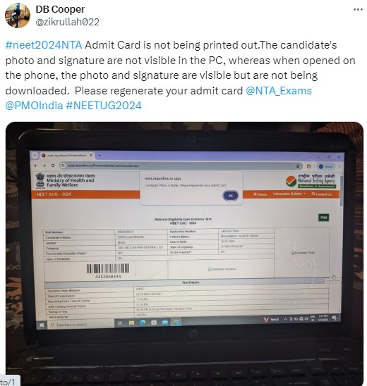 Unlike the previous years, candidates are unable to download the NEET admit card in PDF format. Moreover, upon clicking on the βPrintβ tab, the message displayed is βCandidate Photo/signature is blank, regenerate your Admit Card.β