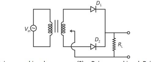 Q: A full wave rectifier circuit with diodes (D1) and (D2) is shown in the figure. If input supply voltage Vin = 220sin(100πt) volt, then at t = 15 msec.