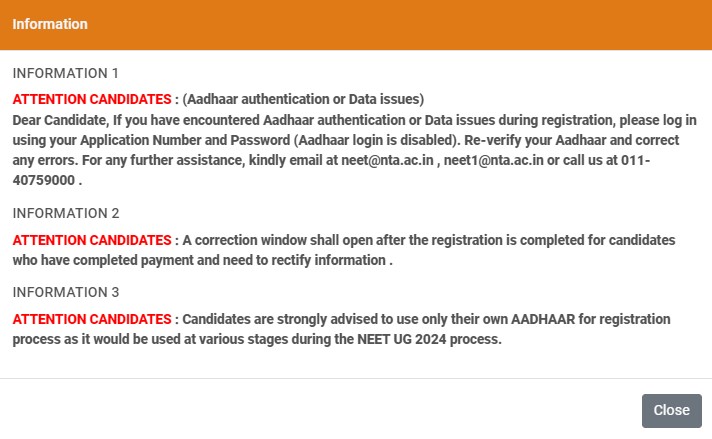 NTA has also advised candidates to enter their own Aadhaar number while applying for NEET 2024. Otherwise, it may lead to the cancellation of the candidature. “Candidates are strongly advised to use only their own AADHAAR for registration process as it would be used at various stages during the NEET UG 2024 process,” states NTA.