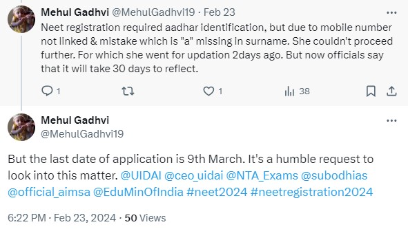 Taking into note of these issues, the National Testing Agency (NTA) has released advisory for NEET 2024 candidates in terms of Aadhaar Card. NTA has stated, “If you have encountered Aadhaar authentication or Data issues during registration, please log in using your Application Number and Password (Aadhaar login is disabled). Re-verify your Aadhaar and correct any errors.”