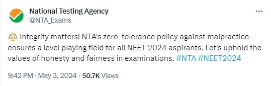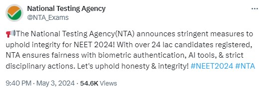 NTA has stated that stringent measures will be taken against any attempt at malpractice during the NEET 2024 exam. Important security measures will be taken through various AI tools, biometric authentication, etc. Take a look at NTA's posts below.
