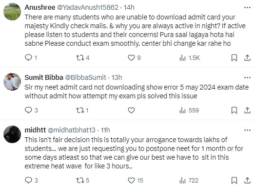 Some candidates have expressed their concerns to NTA on social media platform X. They are facing difficulties in downloading or printing their NEET 2024 Admit Cards.