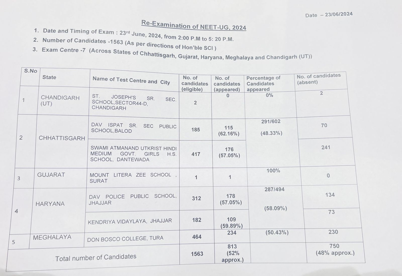 Out of the 1,563 candidates eligible to write the NEET 2024 re-examination, only 813 candidates appeared, accounting for 52 per cent. The rest of the 48 per cent candidates decided to skip the test. The exam was held in five states and union territories, six cities and seven exam centres.