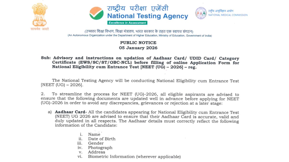 The NTA released an advisory on January 5, 2026, asking candidates to update their aadhaar cards, UDID Card (for Persons with Disabilities) and Category Certificate before applying online for NEET UG 2026.