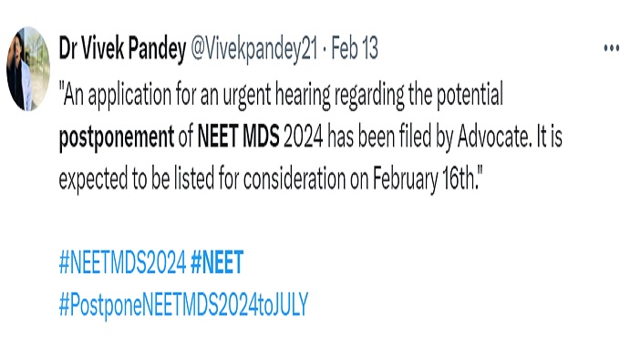 NEET MDS 2024 postponement:Â The aspirants have been demanding to postpone the examination to July 2024. They have been demanding this on the social media platform X for a long and now filed a petition in the apex court which is tentatively listed for February 16, 2024.