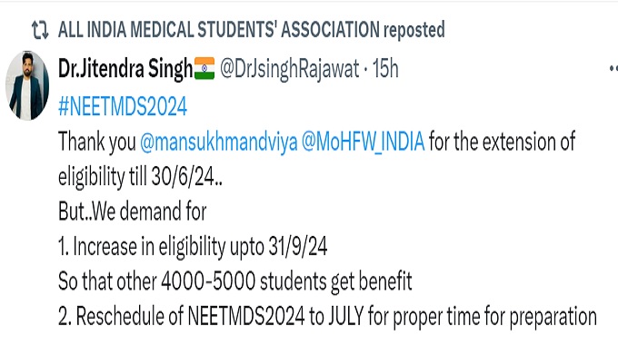 "Thank you @mansukhmandviya @MoHFW_INDIA for the extension of eligibility till 30/6/24..But..We demand for1. Increase in eligibility upto 31/9/24 So that other 4000-5000 students get benefit, 2. Reschedule of NEETMDS2024 to JULY for proper time for preparation," reads his message on X platform.