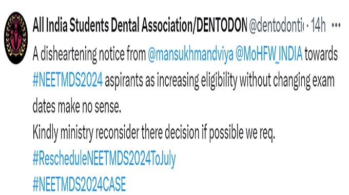 The All India Students Dental Association has said on X, "A disheartening notice from @mansukhmandviya @MoHFW_INDIA towards #NEETMDS2024 aspirants as increasing eligibility without changing exam dates make no sense. Kindly ministry reconsider there decision if possible we req."