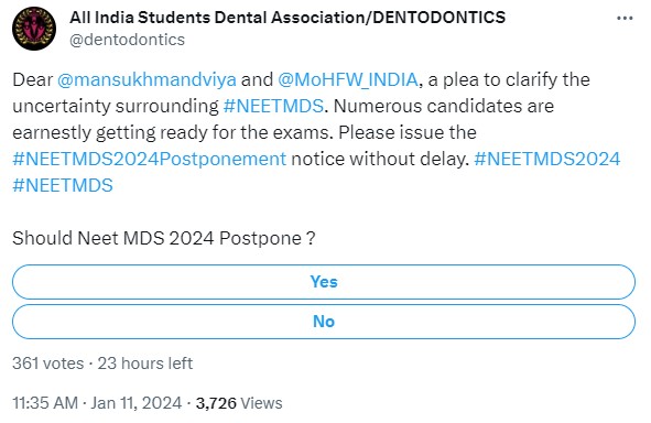 Moreover, the postponement of NEET PG 2024 from March 3, 2024, to July 7, 2024, has instilled a hope among NEET MDS 2024 aspirants that this exam will get postponed as well. However, silence from NBE has increased the anxiety level among candidates.