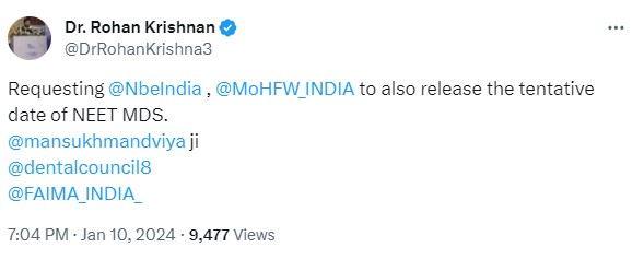 Dr Rohan Krishnan, National Chairman of the Federation of All India Medical Association (FAIMA) has also urged the Ministry of Health and Family Welfare and NBEMS to give clarity on the NEET MDS 2024 exam.