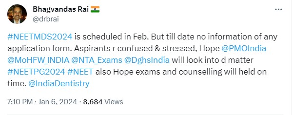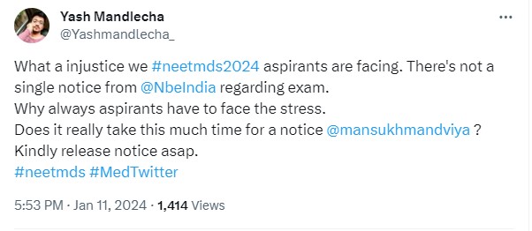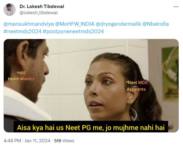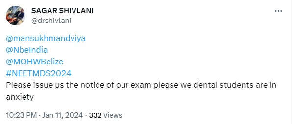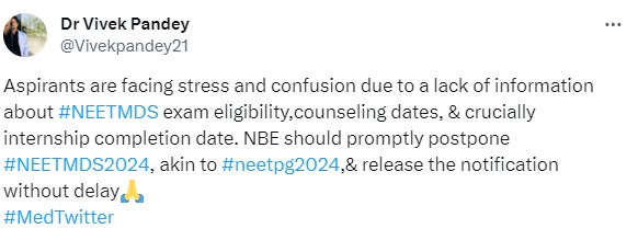 While some students have expressed their disappointment against NBE and requested the exam conducting body to release the latest update on NEET MDS 2024 at the earliest, some have shared that NBE treats the NEET MDS exam inferiorly, which has led them to post updates about NEET PG 2024, which was scheduled to be held later, and not about the NEET MDS exam. Check out some of the social media posts below.
