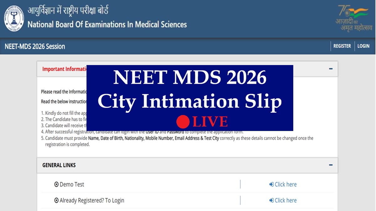 NEET MDS 2026 city intimation slip will be released today at natboard.edu.in. Candidates can download their exam city slip through user ID and password. The direct NEET MDS city intimation slip 2026 download link will be shared on this page. The NEET MDS admit card 2026 will be released on April 29, 2026.
