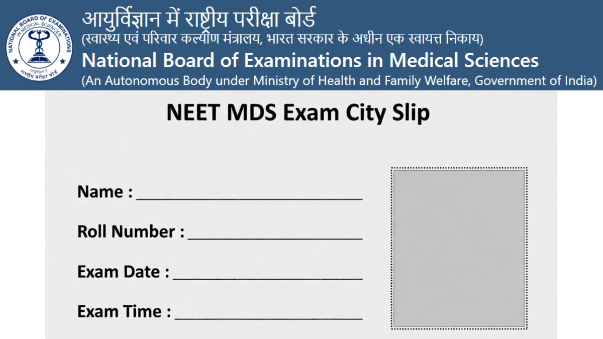 National Board of Examinations in Medical Sciences has issued NEET MDS 2026 city intimation slip. Students who are appearing in the NEET MDS 2026 exam can now check their allotted exam city. Students have to visit the student portal at natboard.edu.in to download NEET MDS city slip 2026. Students have to enter their user ID and password to download city slip. Students must note that NEET MDS exam city intimation slip is not the admit card. NBEMS will issue NEET MDS admit card 2026 soon for all successfully registered students.