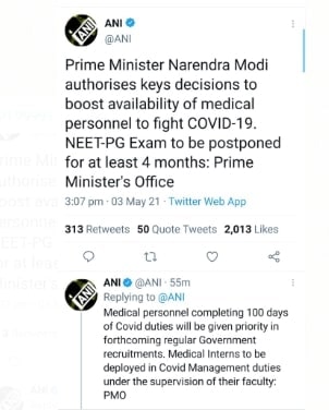 The postponement of medical entrance exam for postgraduate students is among a series of measures the government has approved recently in order to fill the gap of shortage of healthcare professionals to fight corona pandemic. On May 2, 2021, Prime Minister Narendra Modi reviewed various measures including the idea of appointing medical graduates to assist the healthcare sector amid the devastating second wave of the global pandemic.