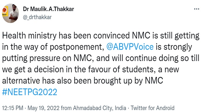 His tweet reads, "Health ministry has been convinced NMC is still getting in the way of postponement, @ABVPVoice is strongly putting pressure on NMC and will continue doing so till we get a decision in the favour of students, a new alternative has also been brought up by NMC."