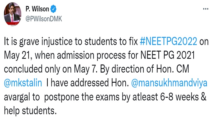 P Wilson's tweet reads, "It is grave injustice to students to fix #NEETPG2022 on May 21, when admission process for NEET PG 2021 concluded only on May 7. By direction of Hon. CM @mkstalin I have addressed Hon. @mansukhmandviya avargal to postpone the exams by atleast 6-8 weeks & help students."