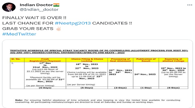 The deadline to apply for NEET PG 2023 special stray vacancy round is November 22, 2023, as tweeted by FAIMA Chairman Dr Rohan Krishnan. There is still no official confirmation on this round.