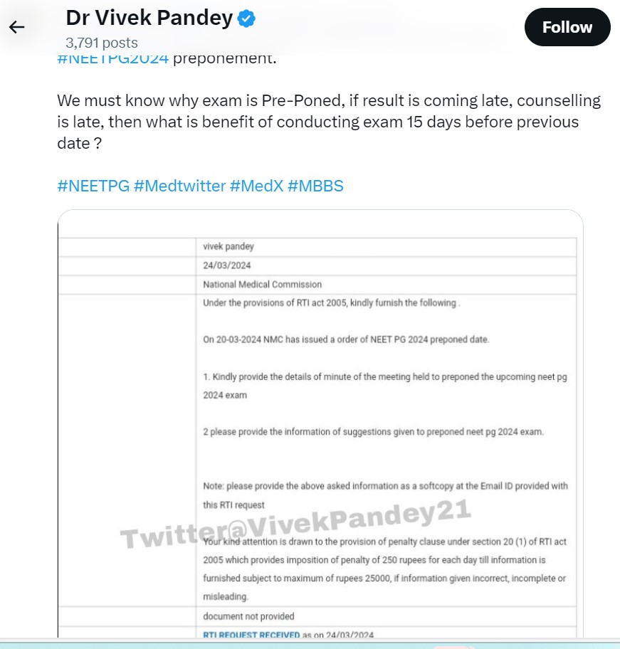 “Kindly provide the details of the meeting held to prepone the upcoming NEET PG 2024 exam. Please provide the information of suggestions given to prepone NEET PG 2024 exam,” he writes in a post shared on X (previously Twitter).