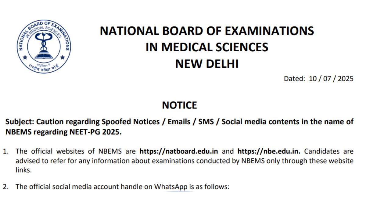 NEET PG 2025 fake notices scam has been busted by NBE through an official notification, along with impersonating NBE and its official website. The board has further notified that apart from a WhatsApp channel, the board do not have any social media platform.