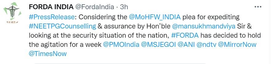 FORDA INDIA tweet on December 9, reads "#PressRelease: Considering the @MoHFW_INDIA plea for expediting #NEETPGCounselling & assurance by Hon’ble @mansukhmandviya Sir & looking at the security situation of the nation, #FORDA has decided to hold the agitation for a week @PMOIndia"