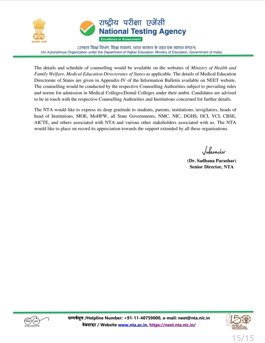 NTA will release the NEET 2022 scorecard via email prior to releasing it on the official website. In case last year's pattern is not followed, students will have to keep visiting this page or the following websites at regular intervals: