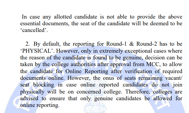 The notice further reads, “By default, the reporting for Round-1 & Round-2 has to be ‘PHYSICAL’. However, only in extremely exceptional cases where the reason of the candidate is found to be genuine, decision can be taken by the college authorities after approval from MCC, to allow the candidate for Online Reporting after verification of required documents online. However, the onus of seats remaining vacant/ seat blocking in case online reported candidates do not join physically will be on concerned college. Therefore, colleges are advised to ensure that only genuine candidates be allowed for online reporting.”