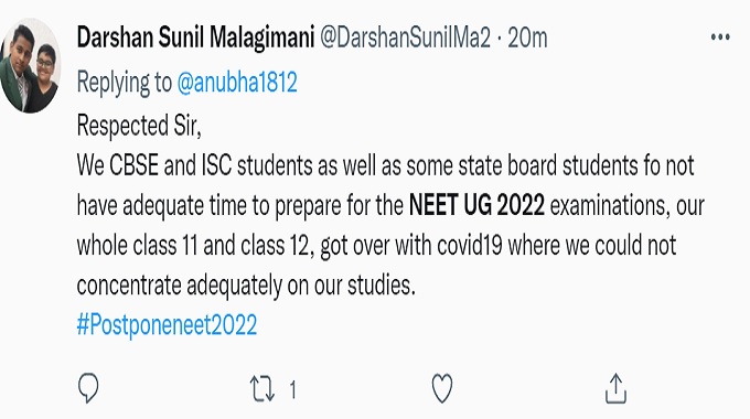 "Respected Sir, We CBSE and ISC students as well as some state board students fo not have adequate time to prepare for the NEET UG 2022 examinations, our whole class 11 and class 12, got over with covid19 where we could not concentrate adequately on our studies."