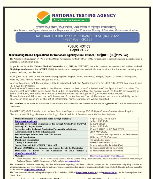 As per the NTA officials, the notification for NEET-UG 2022 can be expected soon. Once the notification is out, it will be available on NTA's official websites - nta.ac.in and neet.nta.nic.in.