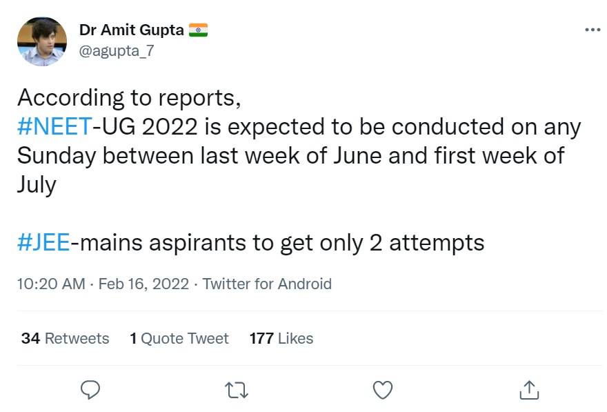 Dr Amit is one of the prominent figures involved in the NEET upper age limit case pending in the Supreme Court. He has tweeted, "According to reports, #NEET-UG 2022 is expected to be conducted on any Sunday between last week of June and first week of July #JEE-mains aspirants to get only 2 attempts"