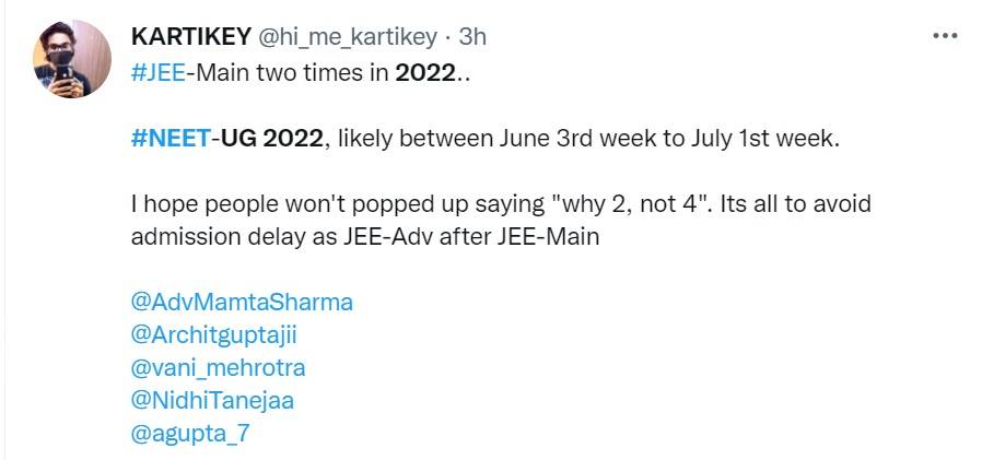 Another tweet says, "#JEE-Main two times in 2022..#NEET-UG 2022, likely between June 3rd week to July 1st week. I hope people won't popped up saying "why 2, not 4". Its all to avoid admission delay as JEE-Adv after JEE-Main"