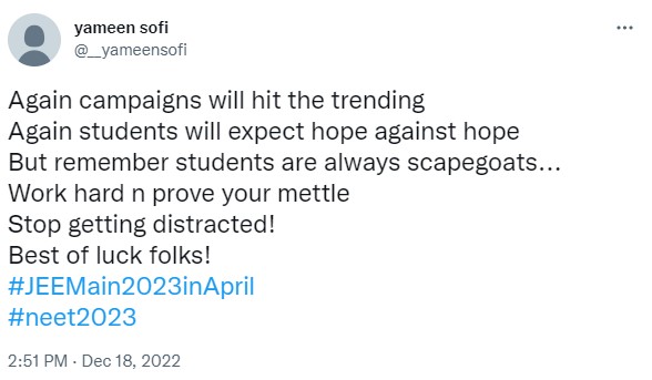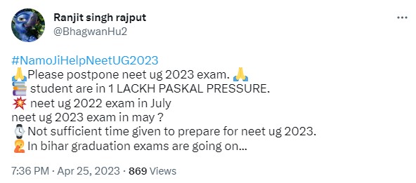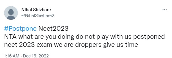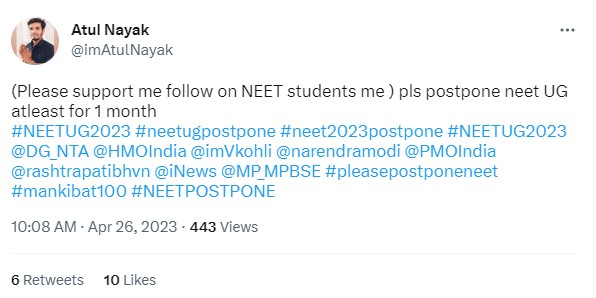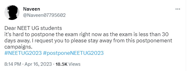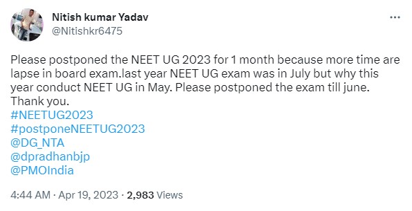 While the student demand to postpone NEET UG 2023 calmed down with the onset of the application process followed by application correction and the reopening of the application process, the students' urges rose again after two weeks prior to the exam. They have started Twitter campaigns addressing the Prime Minister and Education Minister requesting to postpone the NEET 2023 exam date